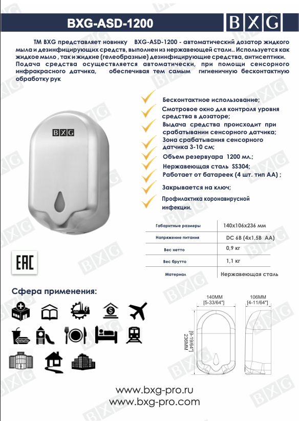Модель BXG-AD-1111 – самый доступный автоматический дозатор дезинфицирующих средств и при этом такой же качественный как вся продукция ТМ BXG.