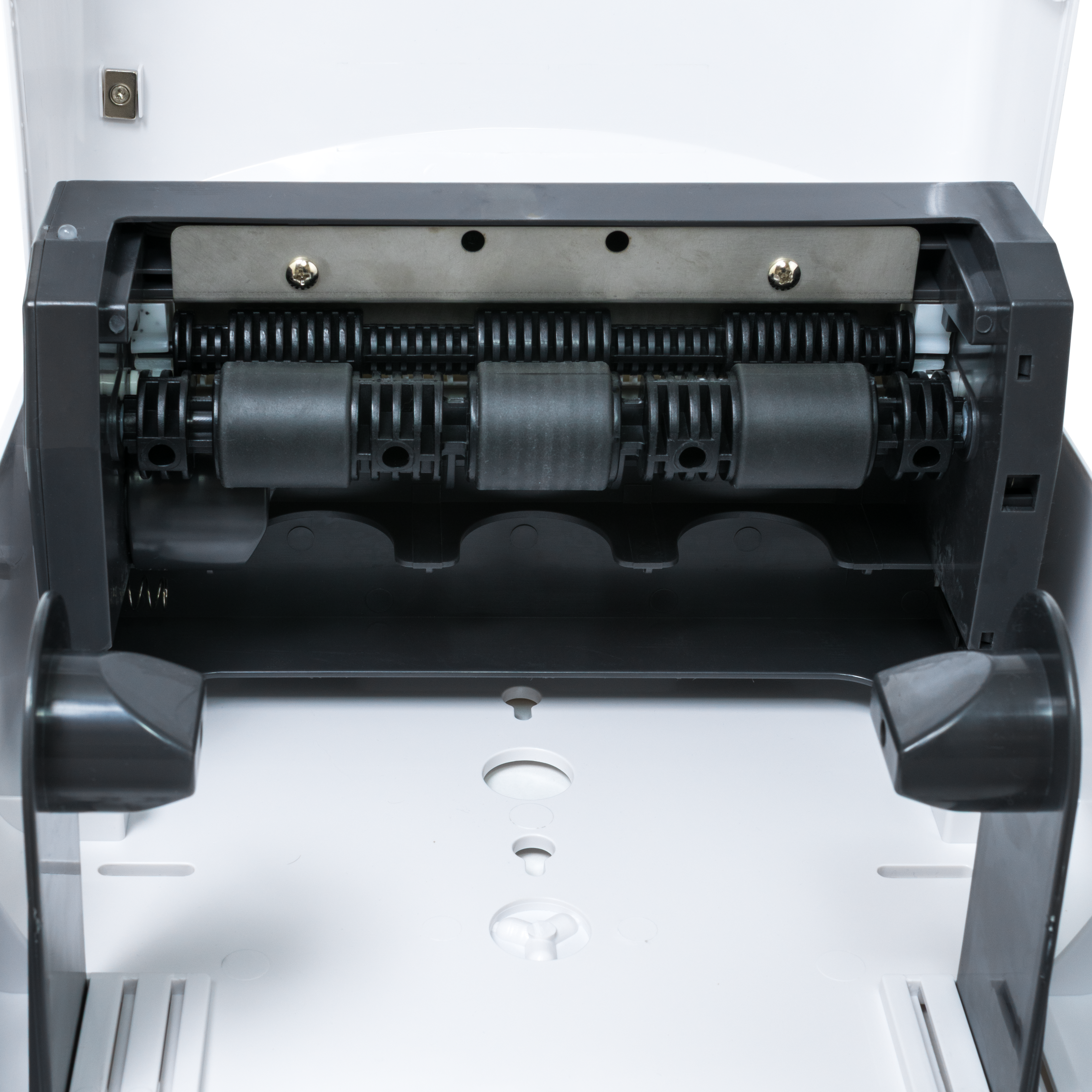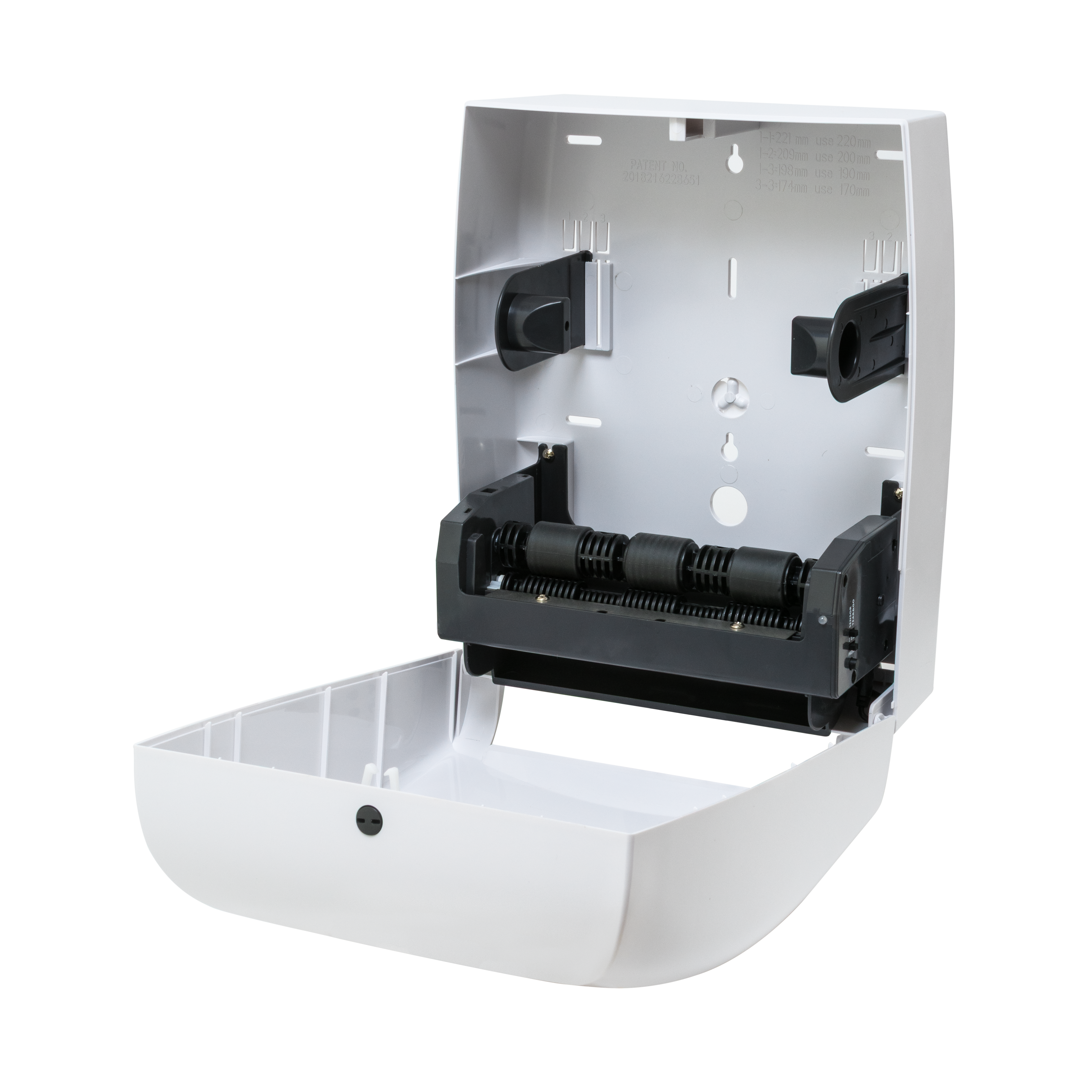 1. Система регулировки ширины рулона (от 17 см до 22 см) с помощью запатентованного механизма переключения втулок. Позволяет подобрать рулоны бумаги различных видов от любого производителя.